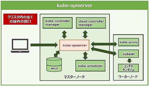 「kube-apiserver」(以下、以降はapiserver)は、ひと言で説明すると「クラスタ内の全ての操作の窓口」になるマスターコンポーネントです。外部からクラスタを操作する窓口となるAPI(アプリケーションプログラミングインタフェース)を公開しており、管理者はAPIを通じてKubernetesをコントロールしていきます(図7)。
