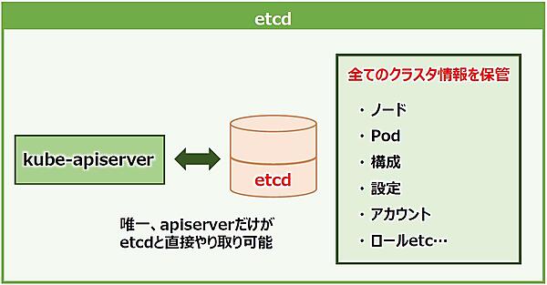 「etcd」は、ひと言で説明すると「クラスタ情報の保管庫」となるコンポーネントです。Kubernetesクラスタに関する全情報(ノードやPod、構成、アカウントやロールなど)を保存します。ノード情報を取得するリクエストが実行されたとき、表示される情報はapiserverがetcdと直接やり取りをして引っ張ってきます。