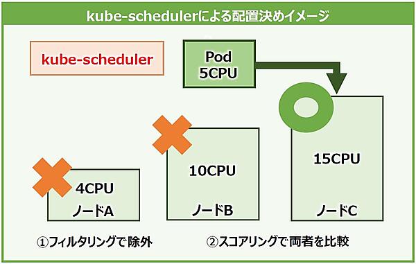 「kube-scheduler」(以下、scheduler)は「Podの配置決め」を行うコンポーネントです。Podが新しく作成され、どのノードにも配置されなかった場合、schedulerがそれを検知して適切なノードに配置します。このとき、schedulerは、どのPodをどのノードに配置するかのみを担当し、実際にPodを作成するわけではないことに注意してください。