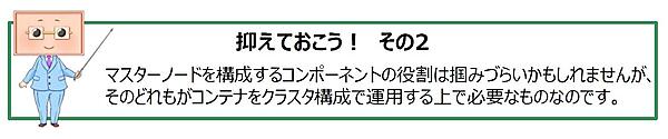 そのため、クラスタの稼動継続力(可用性)を高めたい場合は、マスターコンポーネントをそれぞれ1セットとして起動させたマスターノードを複数用意すると良いでしょう。マスターノードとマスターコンポーネントはセットで覚えてください。
