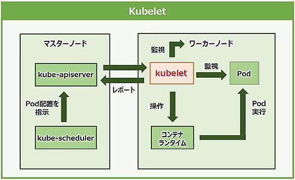 「kubelet」は「エージェント」の役割を持つコンポーネントです。各ノードで動作するKubernetesのエージェントで、Podの起動や管理を担います。schedulerからのPod配置指示をapiserver経由で受け取り、コンテナランタイム(後述)を操作してワーカーノード上にPodを作成します。そしてPodやノードの状態を監視してapiserverにレポートを送信します(図13)。
