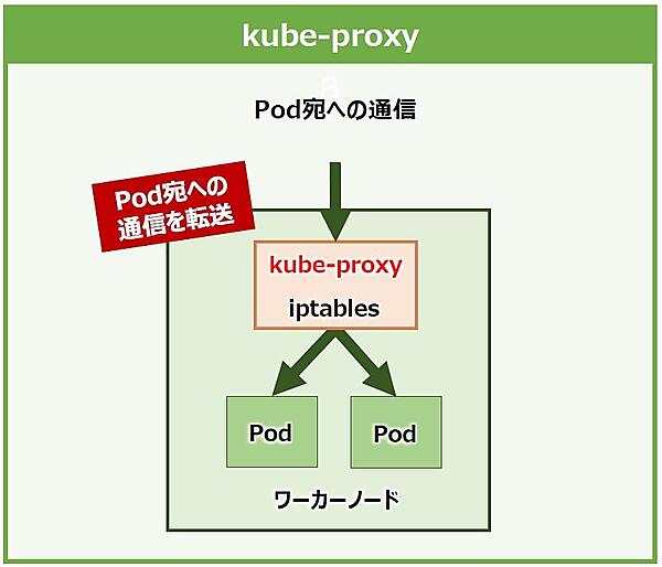 「kube-proxy」は「ネットワーキングと負荷分散をサポート」するコンポーネントです。各ノードで実行され、内部的にはLinuxカーネルのiptablesが利用されています。iptablesは主に通信の許可や遮断の機能と、受信した通信の送信先アドレスを変換し転送する機能などを持ちます。kube-proxyはこれらを使って通信をPodへ転送するためのノード内のネットワークルールをメンテナンスします(図14)。