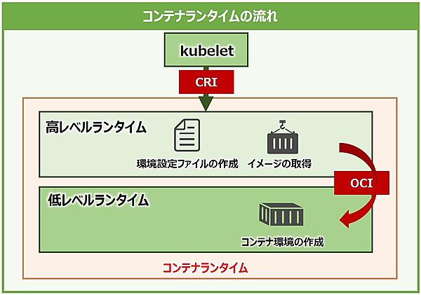 高レベルランタイムは、主にコンテナのイメージを取得し、実行するコンテナ環境の設定ファイルなどを作成します。kubeletからCRI(Container Runtime Interface)というインターフェイスで呼び出されますが、CRIには高レベルランタイムで行うイメージ取得やコンテナ環境の設定などの定義情報が含まれています。