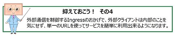 また、IngressにはIngressControllerという専用のコントローラがありますが、これはマスターノードの項で解説したcontroller-managerで実行される他のコントローラと違い、自動で実行が開始されない点に注意が必要です。
