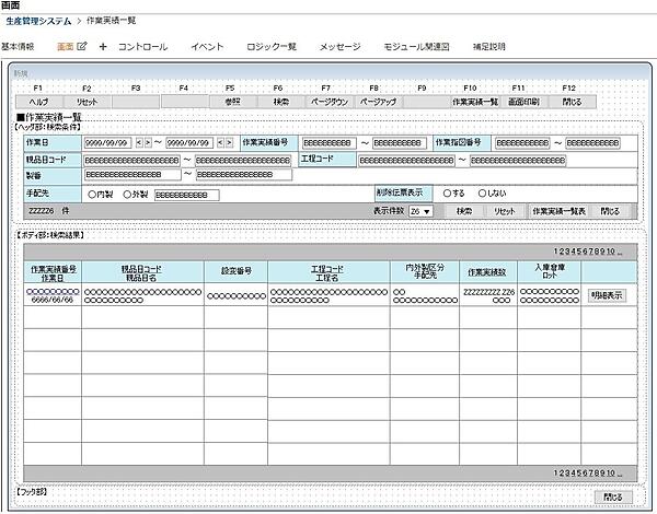 枠組みについては画面5を例に説明しましょう。これはOBDZで設計したERP「GRANDIT」の画面レイアウトです。GRANDITはWebなのにファンクションキーが使えるというユニークなUIを採用しているので(十数年前に私が決めたのですが、やり過ぎだったかも…)、どの画面にも上部にファンクションキーが12個並んでいます。そして、その下にヘッダ部、真ん中にボディ部、一番下にフッタ部というレイアウトを標準化しています。このようなレイアウトを検索画面、入力画面などの画面パターンごとにテンプレート化しておけば、1つ1つの画面で枠組みを都度定義する必要がなく効率化が図られます。