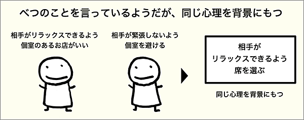 Aさんの発話は、実は「相手がリラックスできるように個室のあるお店が良い」というもので、Bさんの発話は「相手が緊張しないように、個室を避ける」というものでした。