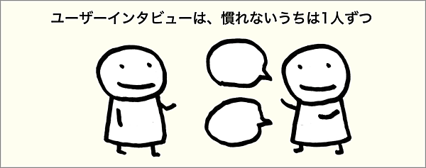 ユーザーインタビューでは、エンドユーザーに1人ずつ話を聞くことをオススメしています。特に慣れていないうちは、1人ずつが好ましいでしょう。