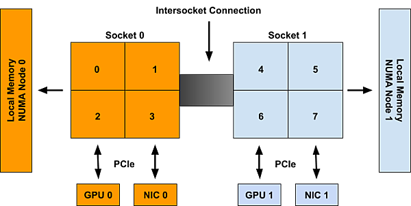 2ソケットでそれぞれ4CPU、2GPU、2NICという2つのNUMAノードを持つシステムの例