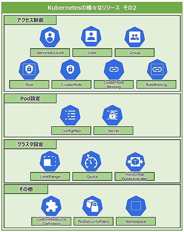 他にも、Kubernetesクラスタ上のリソースへのアクセスを制御し、セキュリティの堅牢性を担保する「アクセス制御」、Podの中で用いる情報の一部を外部へ出力する「Pod設定」、Kubernetesクラスタを安全に扱うための「クラスタ設定」、上記に分類されない特殊な「その他」など、数多くのリソースを活用できます(図3)。リソースには分類できませんが、多種多様なリソースの管理を容易にするため、名前を付けることもできます。