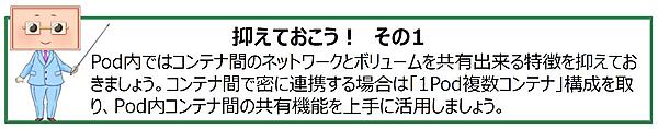 Podの使い方で特に意識しておきたい点があります。第3回で「1コンテナ1プロセス」の考え方を紹介しましたが、Podとその中のコンテナに対しても同様に「1Pod1コンテナ」構成が一般的とされています。
