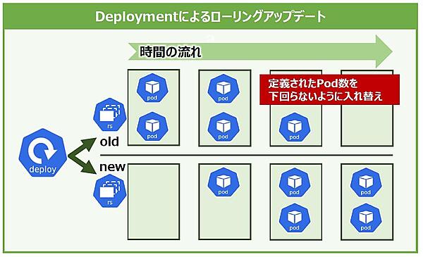 先のスーパーマーケットの例で言うと、ある商品のパッケージが新しくなり、棚にある古い商品を新しい商品に入れ替える必要性があるとしましょう。その際に、古い商品を一度に全て入れ替えるのがReplicaSet単体でPodを管理した場合の挙動です。一方で、古い商品の奥に新しい商品を置き、古い商品が陳列棚から1つ消えたら新しい商品の補充を繰り返し、最終的に全て新しい商品に入れ替えるのがDeploymentによるローリングアップデートです(図9)。なお、ロールバックはその逆で、少しずつ元に戻す方法です。