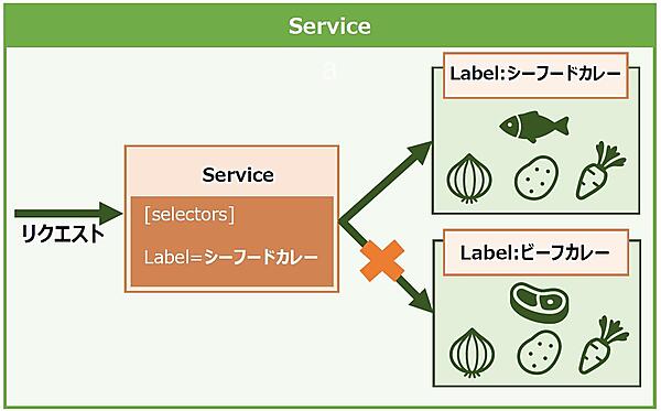 ターゲットとなるPodは、Serviceで定義するLabelとSelectorにより決められます。”カレー”の話を思い出してください。シーフードカレーとビーフカレーがあるとして、シーフードカレーの気分ならManifestというおしゃれなメニューに書いてServiceに伝えることで、魚介の旨味たっぷりなシーフードカレーを提供してくれます(図10)。