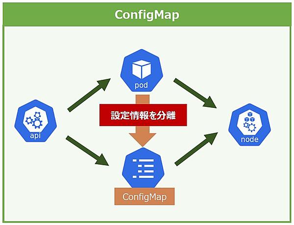 ConfigMapはPodやコンテナの設定値と設定ファイルを保存するためのリソースです。Podの実行時に必要な環境変数、ポート番号などの構成要素をConfigMapによりPodから分離して保存することでワークロードの移植性が向上し、構成の管理や変更が楽になります(図11)。