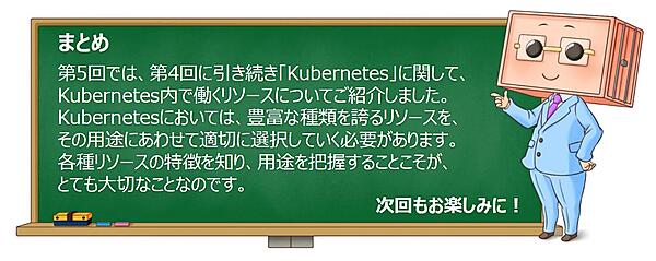 今回は、Kubernetesの論理的な構成に関する要素を紹介しました。Kubernetesクラスタを管理する上では、豊富にあるリソースの特徴を理解し、その用途を把握する必要があることを覚えておきましょう。クラスタ内で稼動させるアプリケーションによってはStatefulSetによる実行順番を管理したり、今後の更新に備えてDeploymentのローリングアップデート機能を使用したりなど、ユースケースにより利用するリソースの組み合わせは様々です。リソースの特徴と用途を把握しておけば、解決するべき課題に対して利用するリソースを適切に選択できるようになります。
