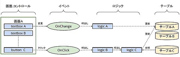 前回、麻里ちゃんがイベントドリブン(イベント駆動)型のアプリケーションについて質問していましたが、そのモジュール構成を図で表すと図1のようになります。画面Aに配置されたテキストボックス(textbox)やボタン(button)などのコントロールで、値を変えたり(OnChang)、クリックしたり(OnClick)するイベントをきっかけに処理が行われるのがイベントドリブンでしたね。前回は、図1の左側の「コントロール」と「イベント」の標準化がテーマでしたが、今回は処理内容を記述する右側の「ロジック」について解説します。