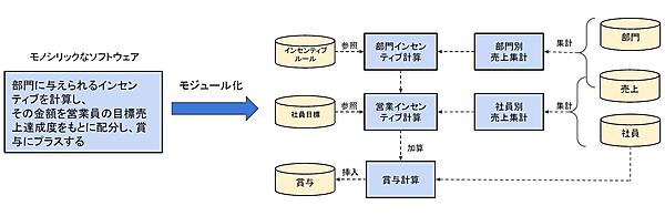 例を挙げて説明しましょう。期末に「部門に与えられるインセンティブを計算し、その金額を営業員の目標売上達成度をもとに配分して賞与にプラスする」という処理を行うため、そのソフトウェアを作ることになったとしましょう。これを1つのモノシリック(一枚岩)なソフトウェアで記述することは可能です。プログラミングを覚えたてのプログラマーに依頼すれば、何も考えずにそう作るでしょう。