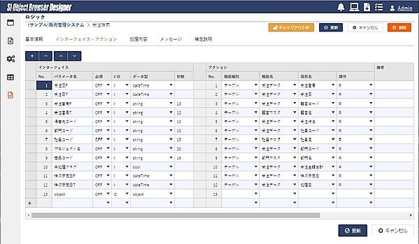 モジュールのインターフェースを図3に示しましたが、それを実際に定義しているのが画面3のインターフェース・アクションです。左側のインタフェース欄は図3左部分と同じで、引数(I/O欄がI)と戻り値(I/O欄がO)が定義されています。ここでは、受注一覧画面の検索条件の項目を引数として受け取り、条件に合致した受注データをオブジェクトとしてリターンすることが定義されています。
