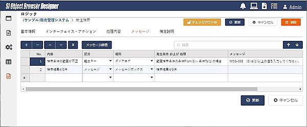 画面5は、ロジックで発生するエラーメッセージなどを定義するページです。中ほどにメッセージ辞書というボタンがありますね。CADではメッセージの辞書化(メッセージを一元管理して、各機能でそれを共有利用する)を行い、どこでどんなメッセージを使っているかを一元管理する仕組みにしています。