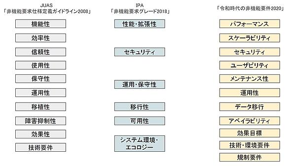 定義を明確にしようという試みもなされています。もう10年以上も前になりますが、一般社団法人日本情報システム・ユーザー協会(JUAS)が2年間かけて230項目の非機能要件を整理し、その成果を「非機能要求仕様ガイドライン 2008」として出版しました。このガイドラインでは非機能要件を図1の左の10項目にまとめ、それぞれについてどのような内容を定義、検証するか書かれています。