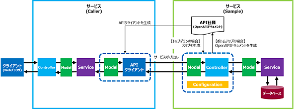 OpenAPI Generatorで生成したAPIクライアントのソースコードは、Spring Bootアプリケーションから呼び出せるライブラリとなっています。生成したソースコードを活用し、APIを呼び出して連携する実装を追加して呼び出し元のサービス(Caller)を作成します。