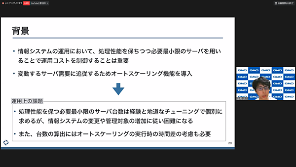 まずはオートスケーリング手法について。これまでオートスケーリングは、スケーリング自体は自動化されているが、サーバー台数の算出は経験と地道なチューニングによっていたと三宅氏。