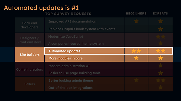 アンケートの結果、経験度に関わらずサイト管理者から最も要望が多かったのが自動アップデート機能。Dries Buytaert氏のプレゼンテーションより抜粋