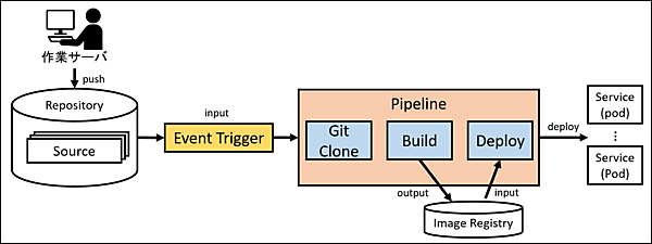 今回は、コンテナ管理基盤としてRed Hat OpenShift Container Platform(以下、OpenShift v4.5)に同梱されているTektonベースのOpenShift Pipelineを使用します。