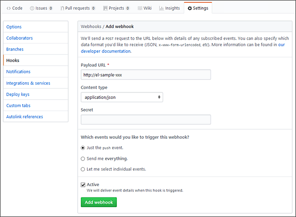 Webhookの設定は、GHES上のサービス(sample)のレポジトリで「Settings」→「Hooks」の「Add webhook」で作成します。「Payload URL」にEventListener作成時に構築したRouteを指定します。