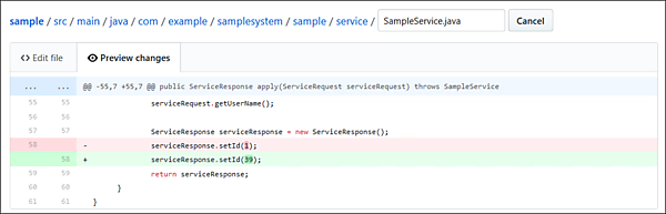 それでは、外部イベント契機で動的にビルド・デプロイするか確認していきます。今回のサービス(sample)は{user_id:1}を返すようにsrc\main\java\com\example\samplesystem\sample\service\SampleService.javaにてハードコードしています。そのため、返す値を下記の通り適当な数値に変更し「Commit changes」します。