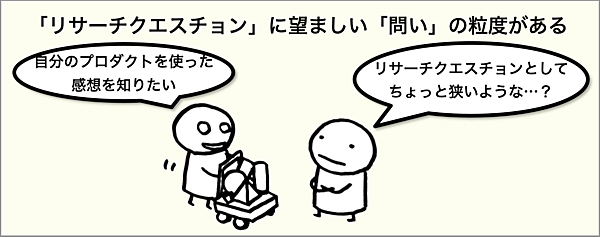 この調査で明らかにすべき命題を「リサーチクエスチョン」と呼びます。インタビュー初心者にとって、リサーチクエスチョンをうまく定義することは意外と難しいようです。即物的な問いを立ててしまうと、インタビューした後になって「問いへの答えはわかったけど、これをどうプロダクトに活かせば良いのか分からない」ことになります。