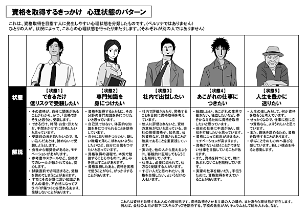 実際に資格試験を受けるユーザーのモチベーションをユーザーインタビューで調査してみると、5つの心理が混ざりあってできていることが分かりました。