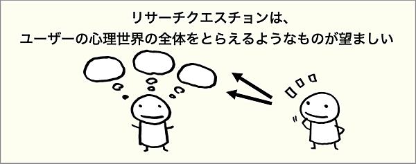 したがって、リサーチクエスチョンとして掲げる「問い」は、「自分の資格取得のアプリを使った感想を知りたい」といった自分目線のものではなく、「資格を取得したいと思うきっかけはなにか」というような、ユーザーがいる心理世界の全体を捉えるようなものが望ましいです。