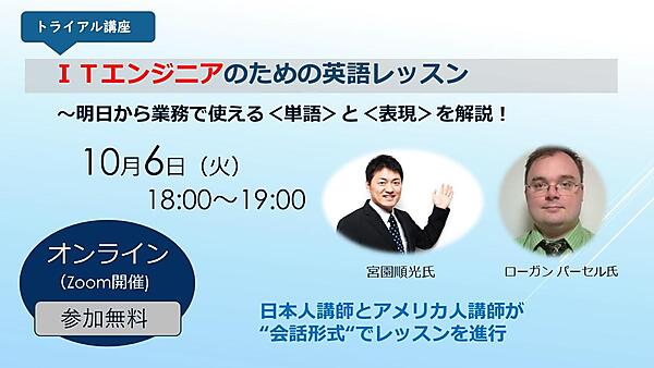 企業研修の講師として活躍されている宮園順光さんと、約11年間、技術者としてIT関連業務に従事した経験もあるアメリカ人講師のローガン パーセルさんの2人が会話形式よりレッスンを進行。宮園さんがパーセルさんに英語で質問し、日本語で訳などを解説していくオンラインLiveセミナーです。