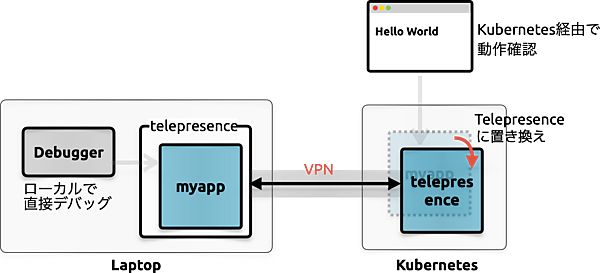 また、(4)のようにmyapp ServiceのEndpointもTelepresence Podを参照しています。よって、NodePort経由でアプリケーションにリクエストを送信すると、ローカルで起動しているmyappからレスポンスが返ってきます。