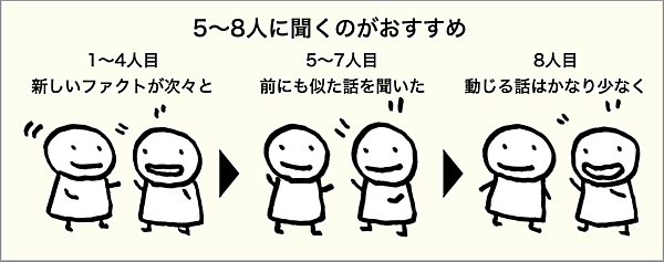 また、運良く条件に合う人が多く見つかっても、今度はプロジェクト期間内にすべての人に話しを聞くのは作業量として厳しいこともあります。5~8人は、その意味でもプロジェクトとして現実的な数なのです。