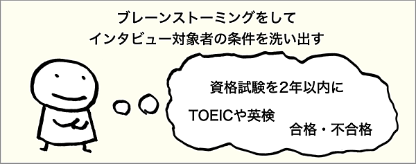ここまで、インタビューをする人数について触れてきましたが、では、インタビューをするに当たって、どのような人に話しを聞くのが良いのでしょうか。「資格をとろうと思うきっかけの心理」をリサーチクエスチョンに考えてみましょう。