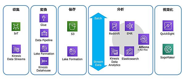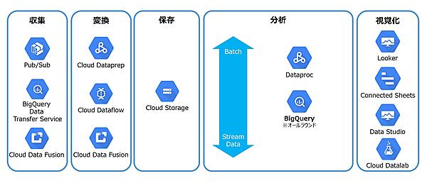 サービスを「収集」「変換」「保存」「分析」「視覚化」の5つに分類しているが、複数の機能を持つサービスも多いため、便宜上の分類と捉えていただきたい。また、各クラウドベンダーのサービスをなるべく同じ視点で分類したいので、ベンダーの分類と異なることもある。