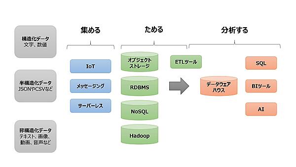 これらのデータ活用基盤では、最低でも「集める」「ためる」「分析する」という3つのアクションが必要だ。下図は、その全体像を表したものである。