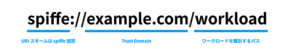 SPIFFE IDはワークロードの識別子となるURI形式で構造化された文字列です。SPIFFE IDはSPIFFEの基礎となる仕様で以下のようなフォーマットで表現されます。
