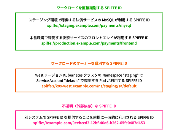 以下は、SPIFFE IDの例です。この例に示すとおり、SPIFFE IDは要件に合わせて自由な粒度で設計することができます。