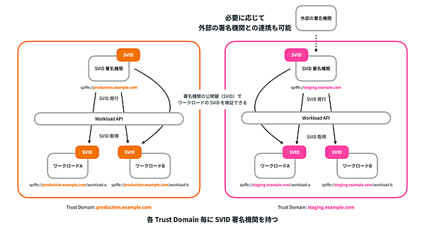 さらに、この署名機関は必要に応じて外部の署名機関と連携させてPKIツリーなどのトラストチェーンを構成することも許容されています。その場合には、ワークロードのSVID検証を行う際に署名機関のSVIDに加えて、外部の署名機関の公開鍵が必要になります。