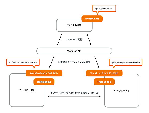 同一のTrust Domainを持つワークロード同士、異なるTrust Domainを持つワークロード同士、それぞれの相互認証がどのように実現されるかは、後述の「ワークロード同士が相互認証するフロー」で紹介します。