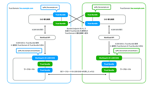 ここではfoo.example.comとbar.example.comの異なるTrust Domain配下でワークロードが稼働していると仮定します。通常であれば、異なるTrust Domain配下のワークロード同士は相互認証ができません。この制約は署名機関が異なることに起因しており、bar.example.comで発行されたX.509 SVIDをfoo.example.comのTrust Bundleでは検証できないことを意味します。