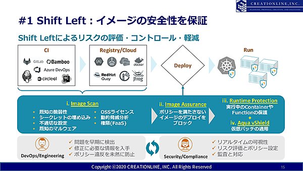 1つめはイメージスキャン。コンテナイメージに脆弱性やマルウェアが含まれないかどうかをスキャンするものだ。これは、コンテナイメージ開発という早期段階でセキュリティのリスクを潰しておこうという「Shift Left」という考えに基づく。
