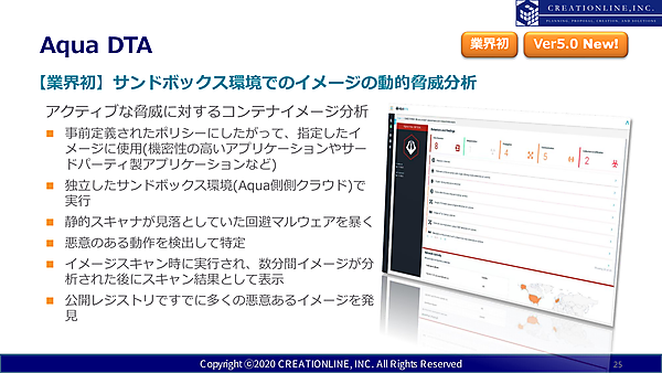 注目すべき機能としてはDTA(動的脅威解析)がある。これは、サンドボックス環境でコンテナイメージを実行して脅威を分析するものだ。