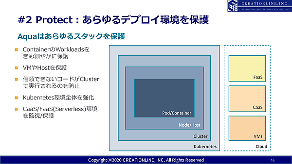 また、インフラのセキュリティについては、クラウド環境のセキュリティを管理するAqua CSPM(Cloud Security Posture Management)や、ペネトレーションテストの機能も含むKubernetesのセキュリティ機能を注目機能として解説。ワークロードの保護としては、前述のDrift PreventionやvShieldを挙げた。