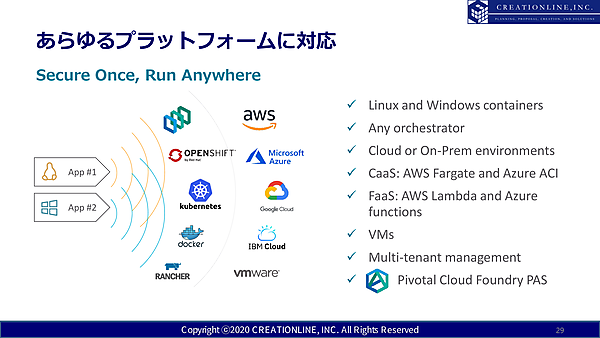 また、さまざまなプラットフォームに対応していることも特徴だ。AWSやAzureなどのクラウドCaaSや、オンプレミスのKubernetesなどのオーケストレーター、LinuxやWindowsなど、幅広い環境で使える。「たとえば、クラウドからオンプレミスのOpenShiftに移行したいというときも、そのままAquaを使い続けられます」(鈴木氏)。