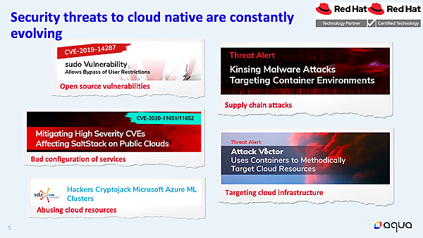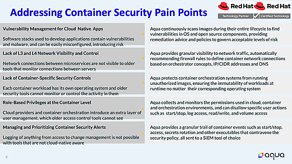 マグルーダー氏も「OpenShiftのセキュリティ機能はプラットフォームのリスクが中心で、コンテナ側にはあまり干渉しません。一方でAquaはコンテナ側が中心で、守備範囲が違い、補完関係にあります」という。