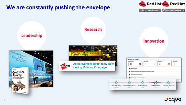 さらにLee氏は、ほかのセキュリティ企業に対するAquaのアドバンテージとして、「Leadership」「Research」「Innovation」の3つを挙げた。